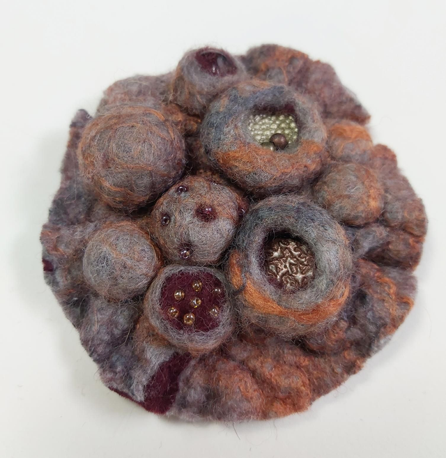 My Rockpool brooches were inspired by the rugged Scottish coastline and each one is totally unique. This brooch has been wet felted using dark grey and deep wine shades of Bergschaf with copper coloured botanical fibres. It has been embellished with beads. Approx 8cm dia. Price includes UK postage.