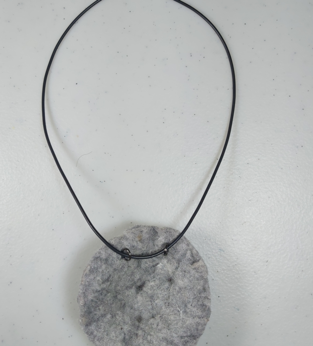 My Rockpool Pendants were originally inspired after beach combing on the north west coast of Scotland. This highly textural Pendant has been wet felted using light neutral shades of Superfine Merino fibres and copper coloured botanical fibres. It has been decorated with hand embroidery and beads. The black cord is threaded through two metal jump rings and is approx 44cm in length, extending to 48cm. The pendant is approx 7.5cm in dia. Price includes UK postage.