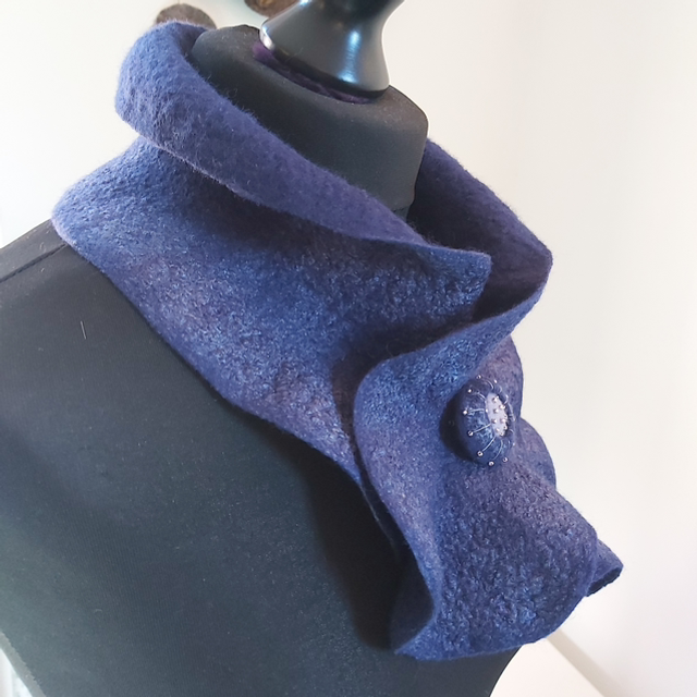 This beautiful, stylish Roll Edge Ruffle Collar has been wet felted using Superfine Merino in the blue colour way “Tanzanite” & decorated with botanical fibres.