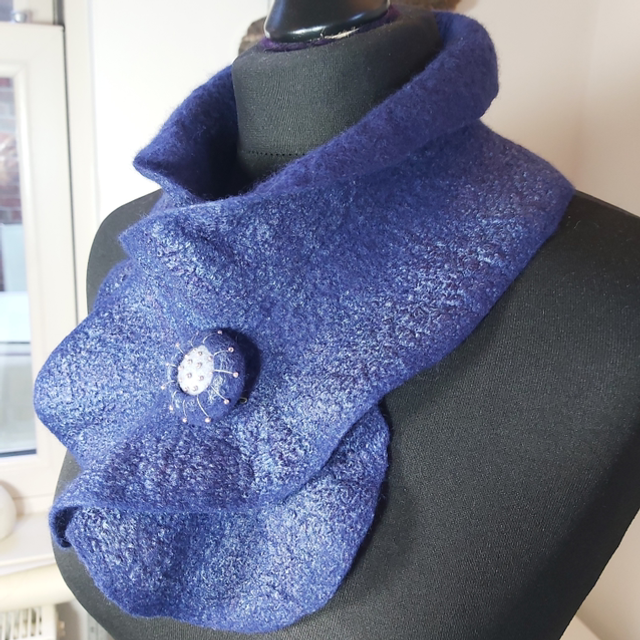 Its sculptural shape ensures a snug fit against the back of the neck keeping your neck warm but it is so lightweight and comfortable you could easily forget you're wearing it! The collar is held in place with a unique wet felted and beaded brooch fastener. Using a brooch as the fastener allows the wearer to decide how loose, or tight they wish to wear their collar. Overall length 72cm.