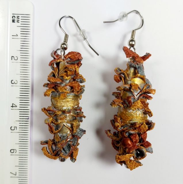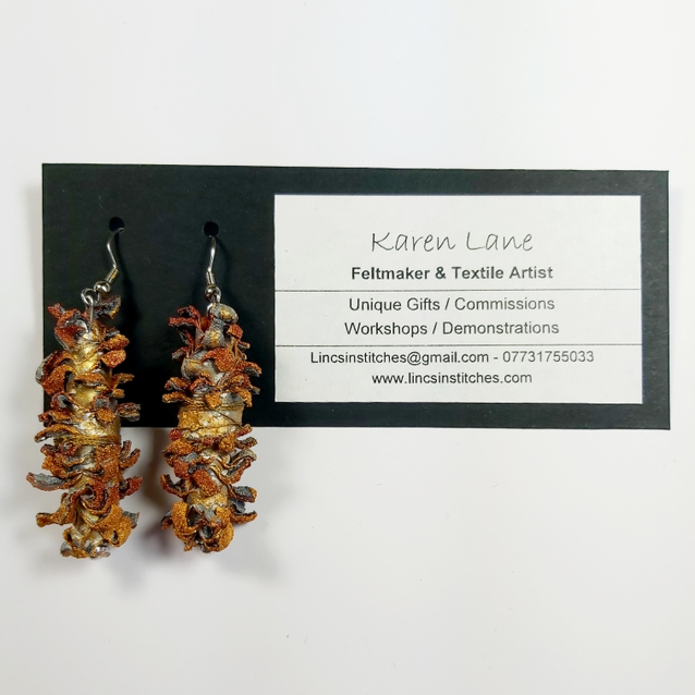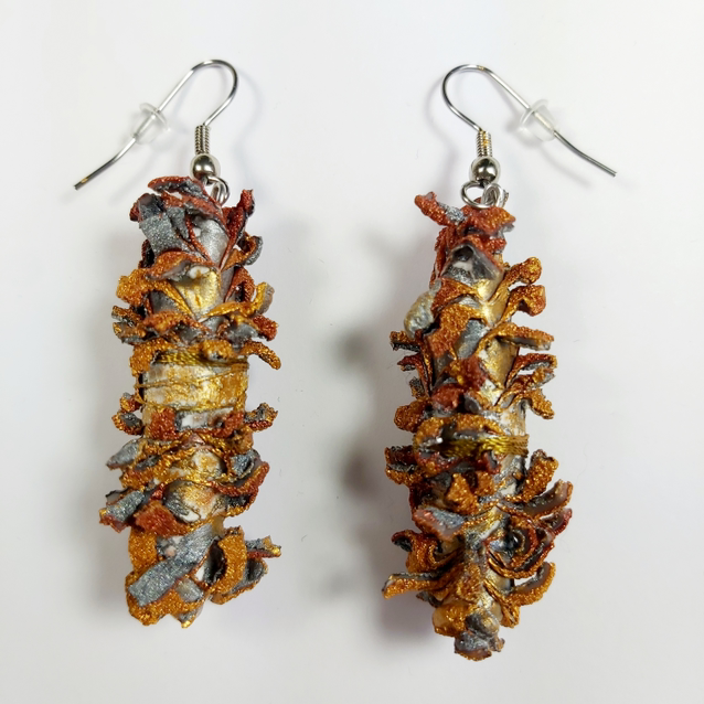 These statement earrings have been made from painted and heat distressed Tyvek in shades of bronze, gold and silver.