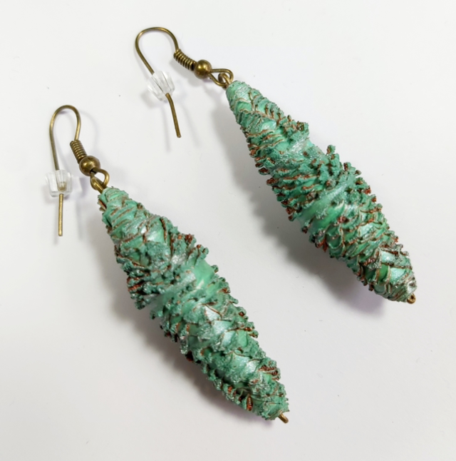 These statement earrings have been made from painted and heat distressed Tyvek in shades of green with a hint of bronze.